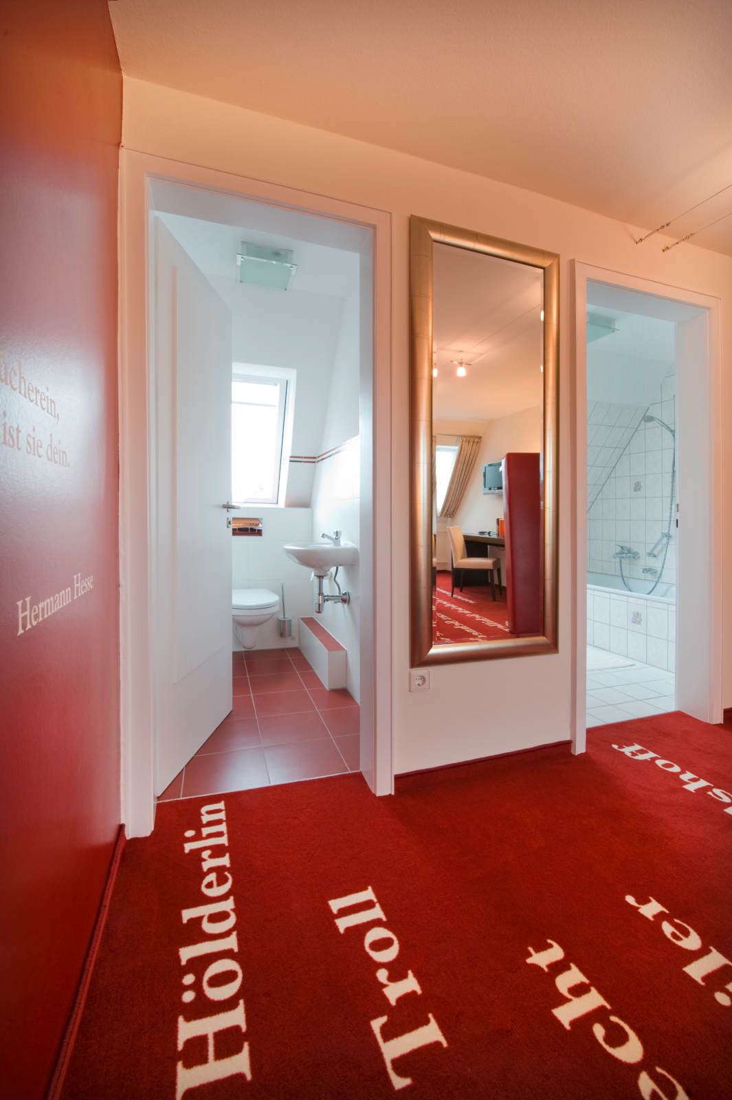 Verbringen Sie inspirierende Stunden umgeben von den beflügelten Worten eines großartigen Franz-Josef Schiller oder Hermann Hesse und lassen Sie sich von den lebendigen, kräftigen Farben des Raumes beflügeln.