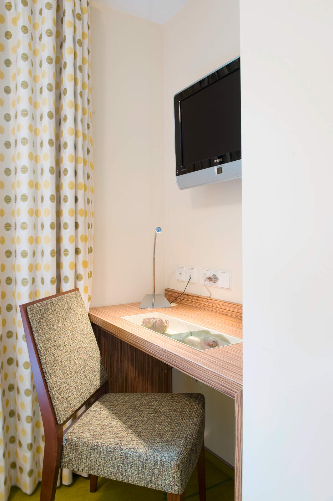 Zur Ausstattung gehören Lärmschutzfenster, WC / Dusche, Flat-TV, Telefon, Internetanschluss und W-LAN, Haarfön, Kosmetikspiegel, Schreibtisch, Sitzmöbel